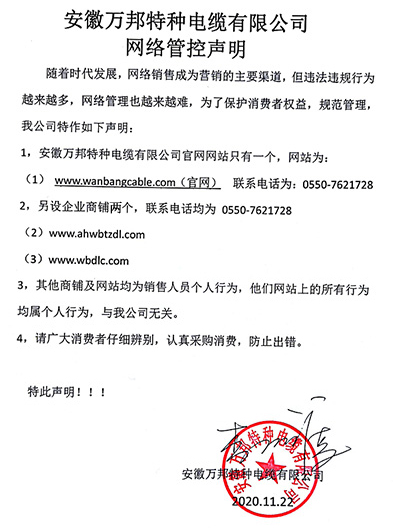 鄭重聲明:安徽萬邦特種電纜有限公司官方網站為:www_wanbangcable_com.mk688.cn,除此之外無任何子網站或合作網站,其余均為假冒偽劣。電話:0550-7621728 13485756353 地 址:安徽省天長市滁州高新技術產業開發區經四路29號